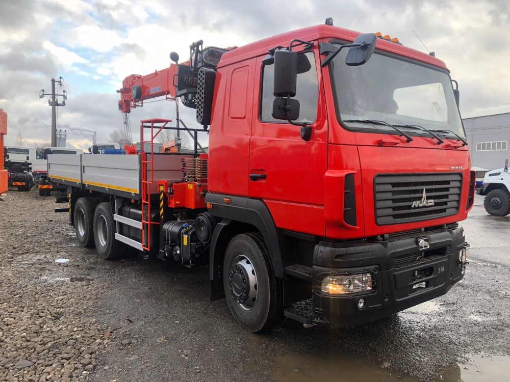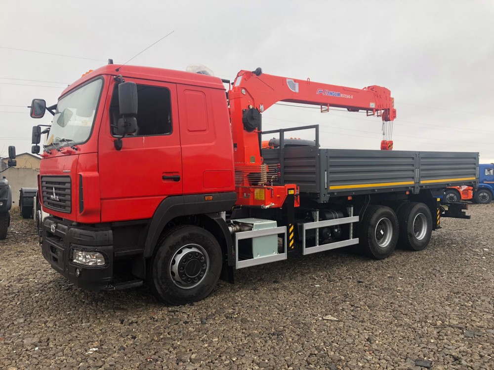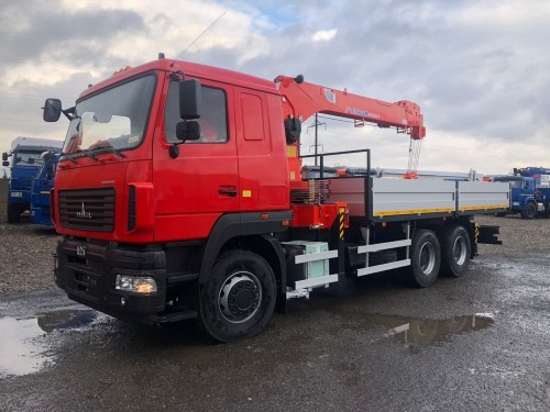 Надежный трехосный бортовой автомобиль МАЗ с манипулятором и колесной формулой 6х4, для эксплуатирования на магистралях и за их пределами. Тросовый кран манипулятор KS1256 установлен за кабиной.