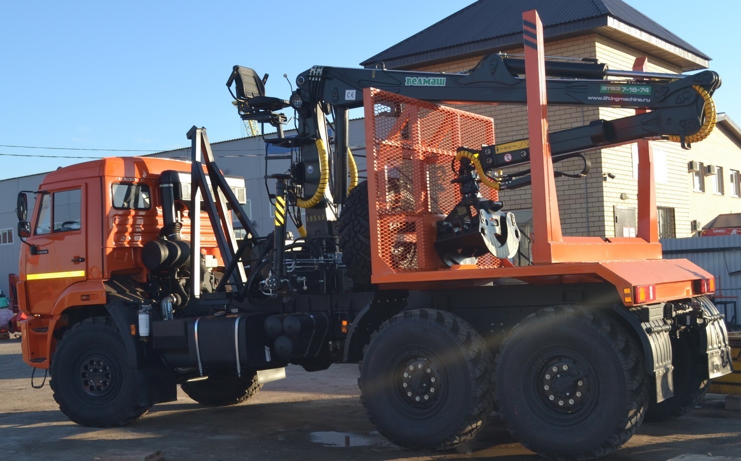 Лесовоз КАМАЗ 43118 6х6 с ГМУ VELMASH VM10L74 - один из разновидностей тяжелой спецтехники, который транспортирует сортимент в составе автопоезда (прицеп или полуприцеп).